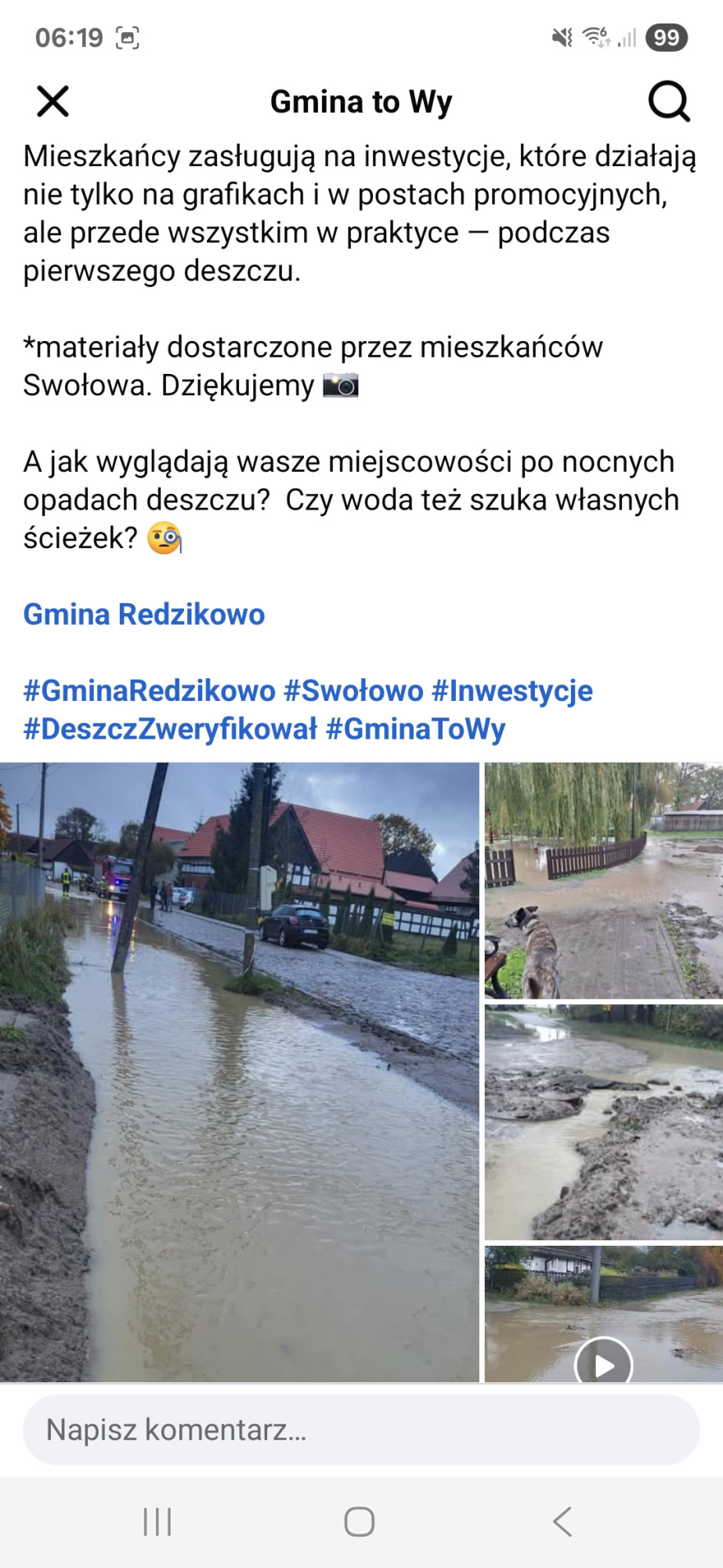Po awarii przepustu w Swołowie i chwilowym zalaniu drogi w sieci wybuchła burza w gminie Redzikowo. Głos zabrał radny Grzegorz Winiarski, który w komentarzu napisał, że „psy szczekają, a karawana jedzie dalej”.
