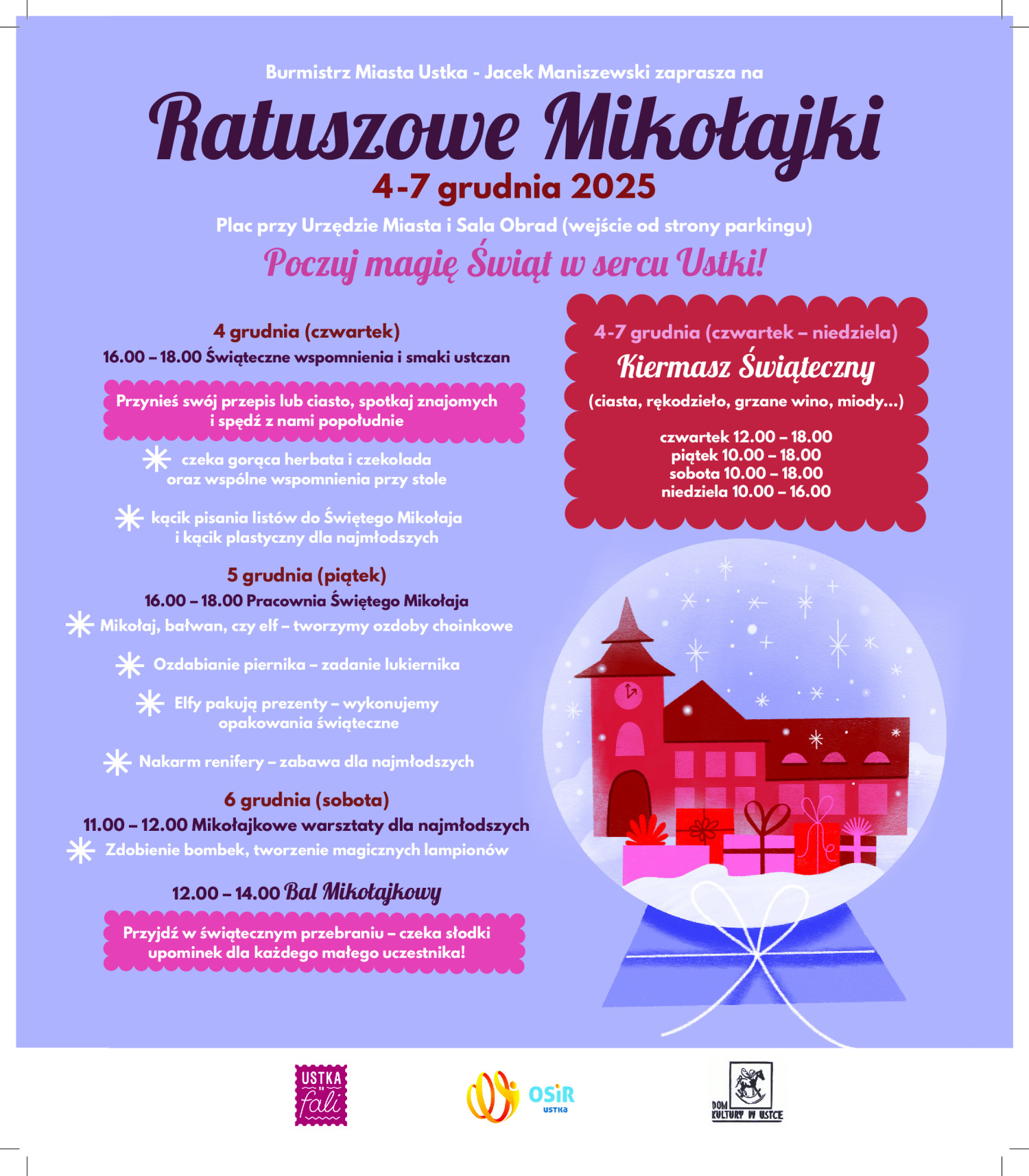 Od 4 do 7 grudnia plac przy Urzędzie Miasta w Ustce ponownie zamieni się w tętniącą życiem świąteczną wioskę. „Ratuszowe Mikołajki” to jedno z najbardziej wyczekiwanych wydarzeń zimy – pełne warsztatów, zabaw, animacji i wspólnego celebrowania grudniowej magii.