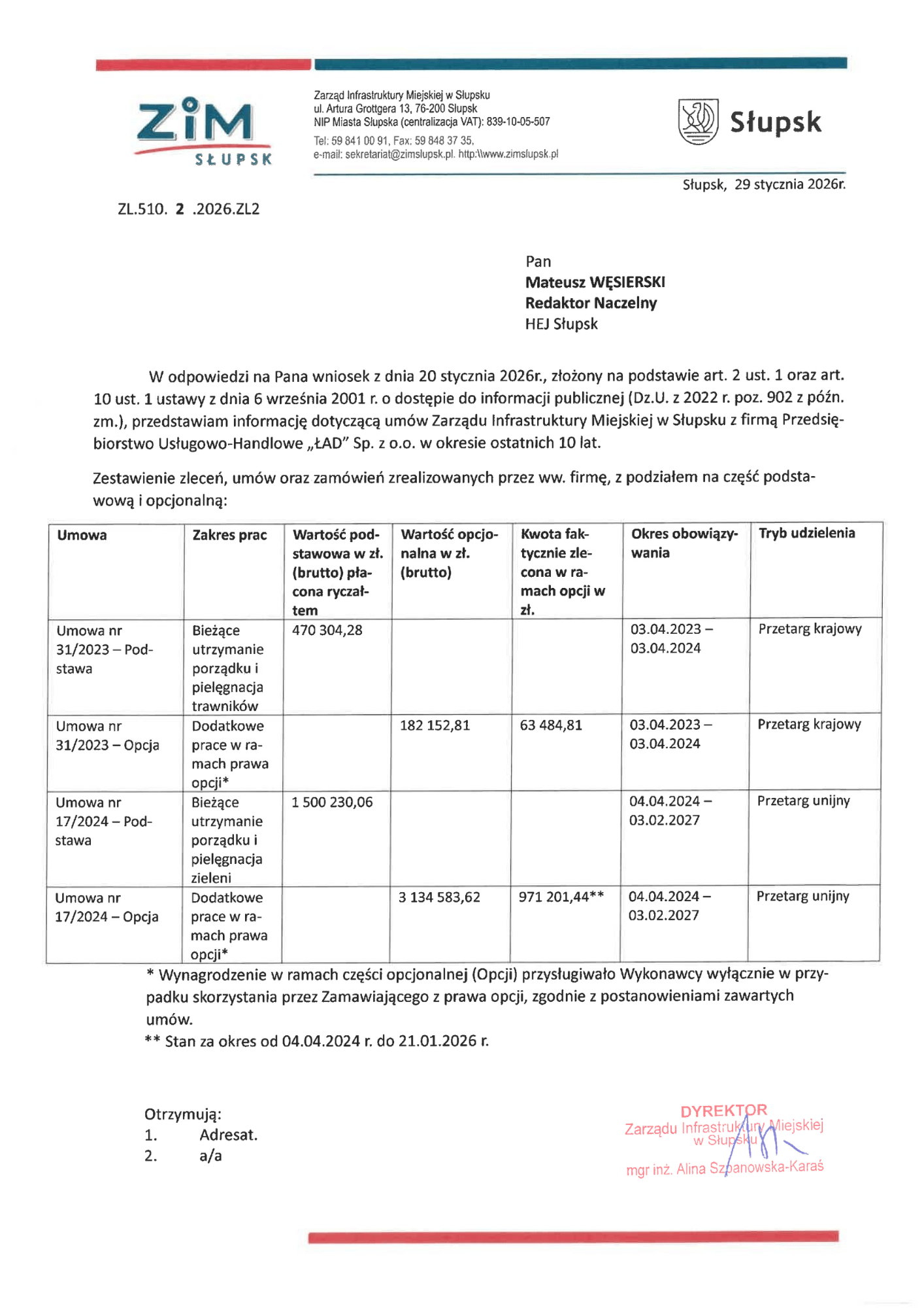 • Okres 2024-2027: Nowy kontrakt ma znacznie większy zakres. Wartość podstawowa to 1 500 230,06 zł brutto. Co więcej, w ramach tego zlecenia (stan na styczeń 2026 r.) miasto wypłaciło już za dodatkowe prace opcjonalne kwotę 971 201,44 zł.