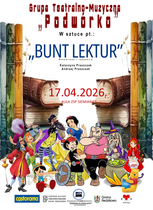 W Siemianicach szykuje się wieczór z teatrem, humorem i ważnym przesłaniem. Już w piątek 17 kwietnia o godz. 18.00 w auli Zespołu Szkolno-Przedszkolnego im. Czesława Miłosza swoją najnowszą sztukę wystawi grupa teatralno-muzyczna „Podwórko”. Na scenie zobaczymy spektakl „Bunt lektur”.