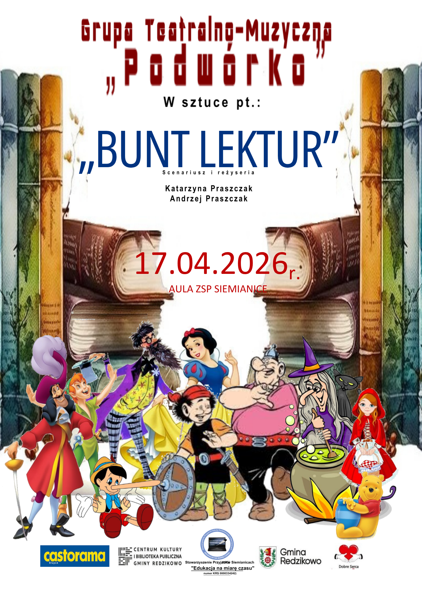 W Siemianicach szykuje się wieczór z teatrem, humorem i ważnym przesłaniem. Już w piątek 17 kwietnia o godz. 18.00 w auli Zespołu Szkolno-Przedszkolnego im. Czesława Miłosza swoją najnowszą sztukę wystawi grupa teatralno-muzyczna „Podwórko”. Na scenie zobaczymy spektakl „Bunt lektur”.